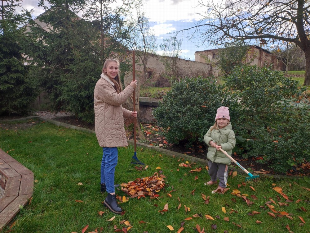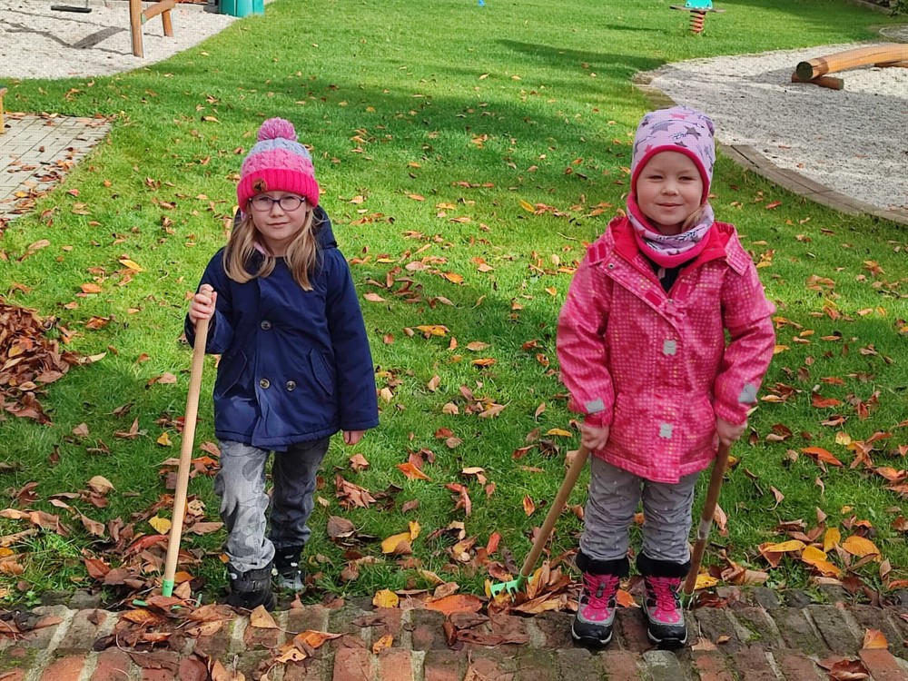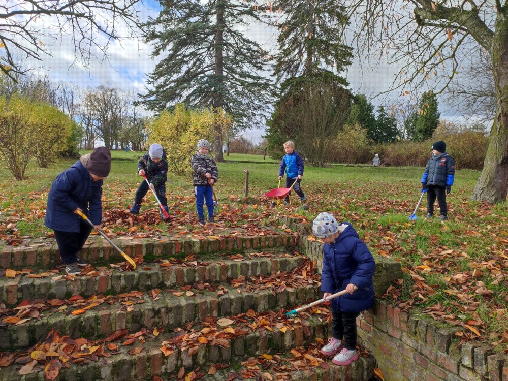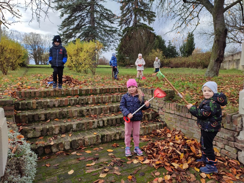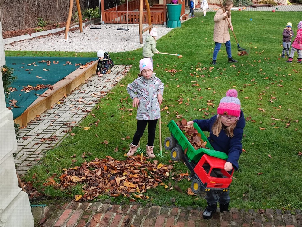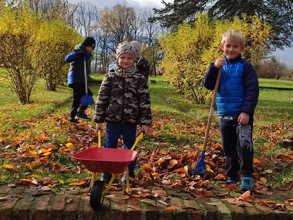 Počasí nám dnes přálo, proto se děti vydaly na zahrádku, aby hrabaly spadané listí a připravily ježčí domečky. Práce je moc bavila a už se těší na zítra, že budou pokračovat.