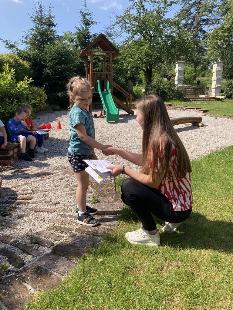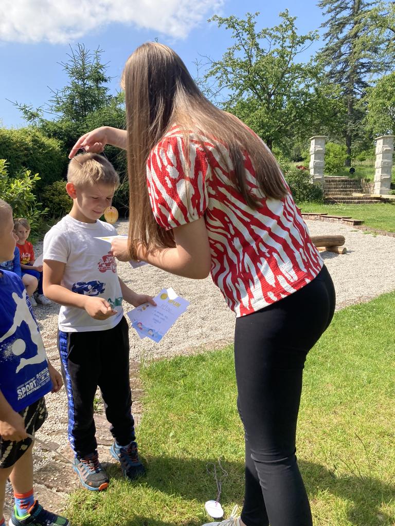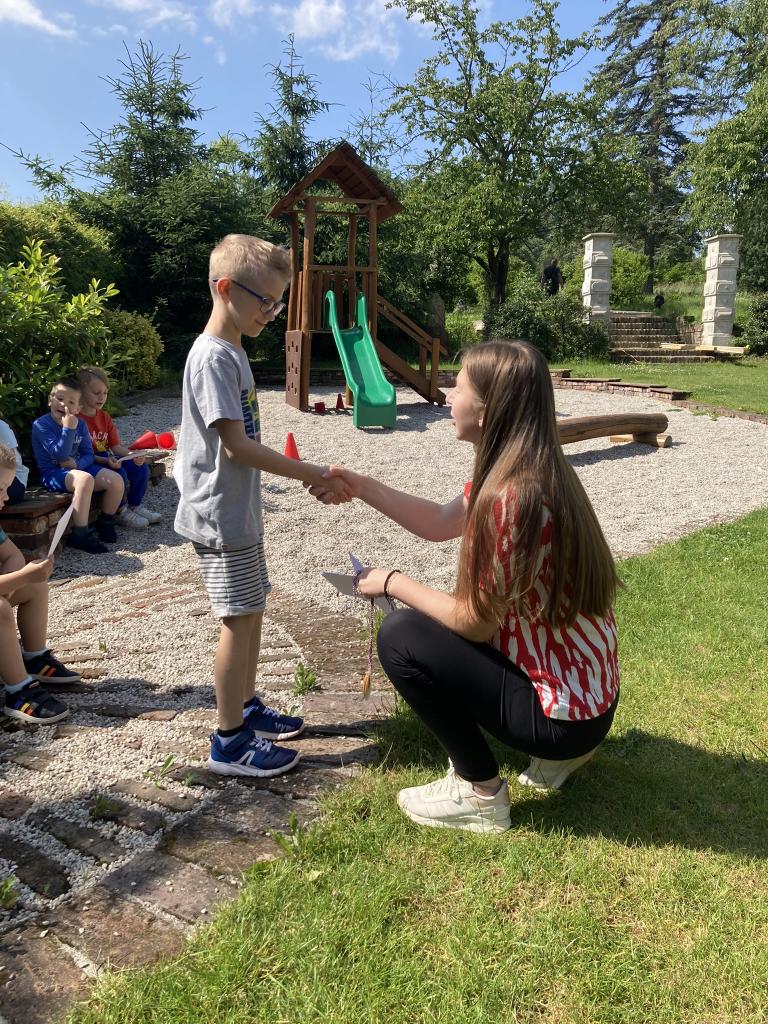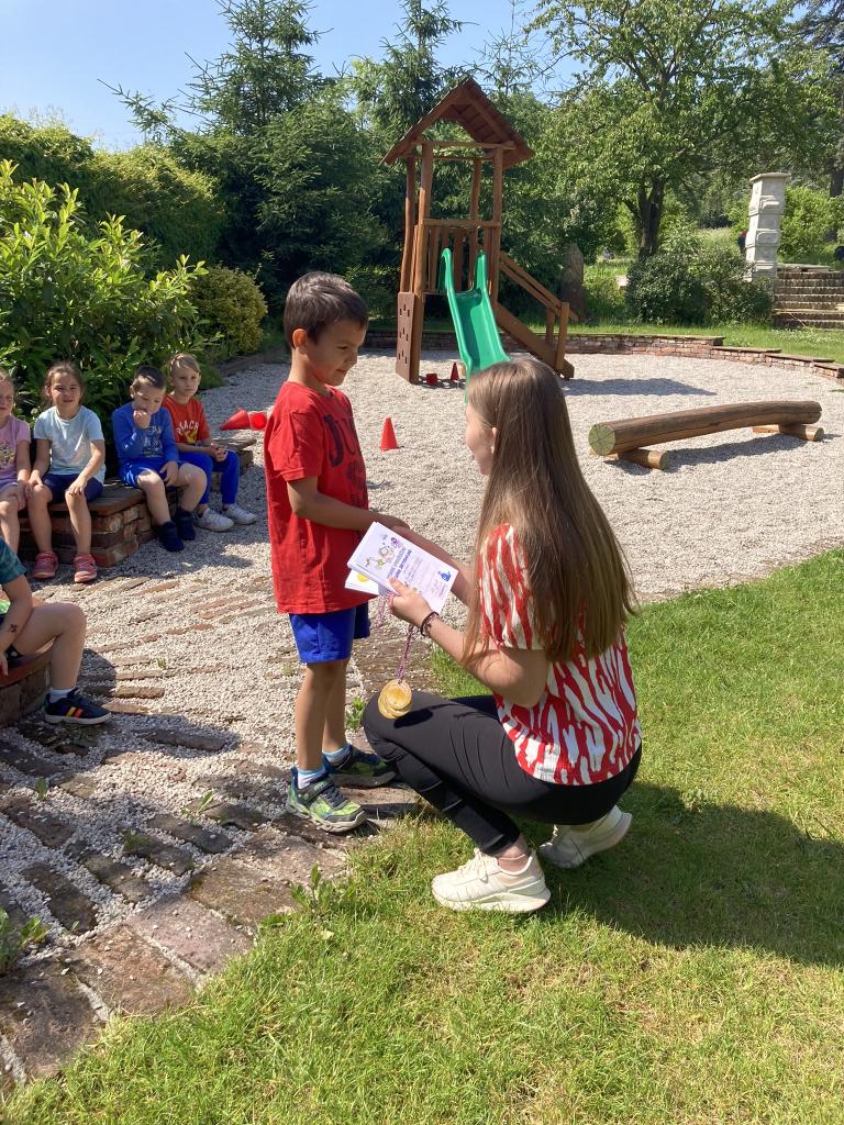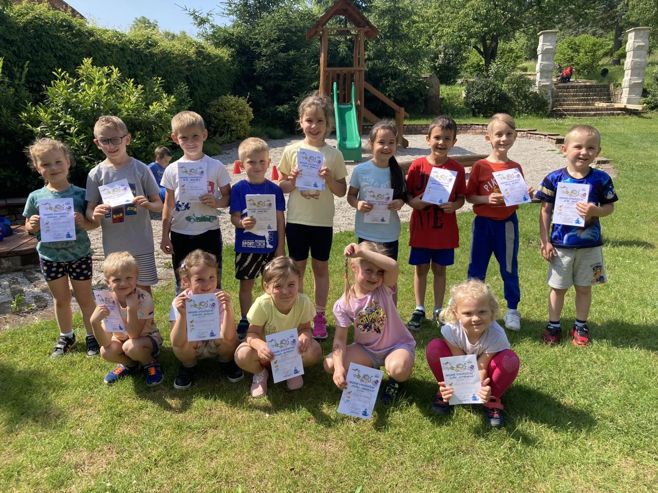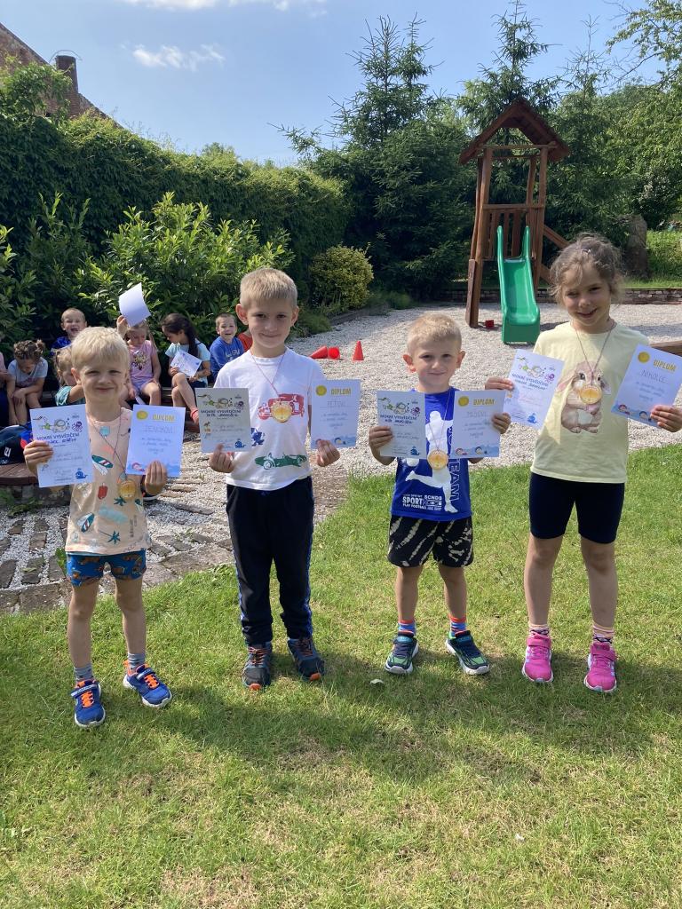 Předávání diplomů plaváčkům a poděkování Nikolce, Péťovi, Míšovi a Denískovi za reprezentaci naší mateřské školy v plavecké soutěži.