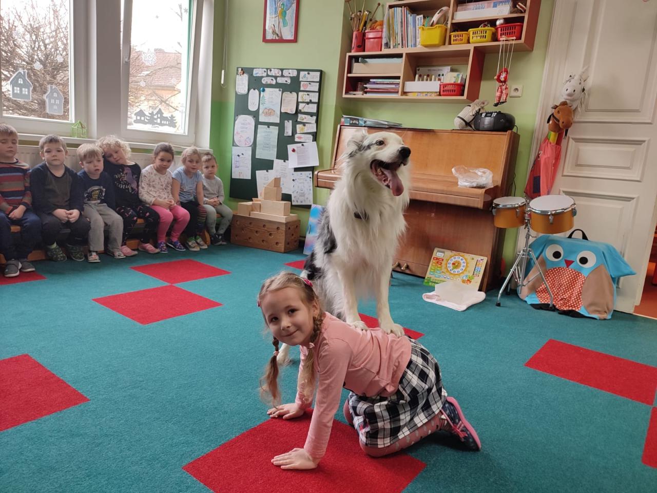 Dnešní dopoledne si děti užívaly hry s pejskem Lucasem, který jim předvedl všechny své dovednosti.