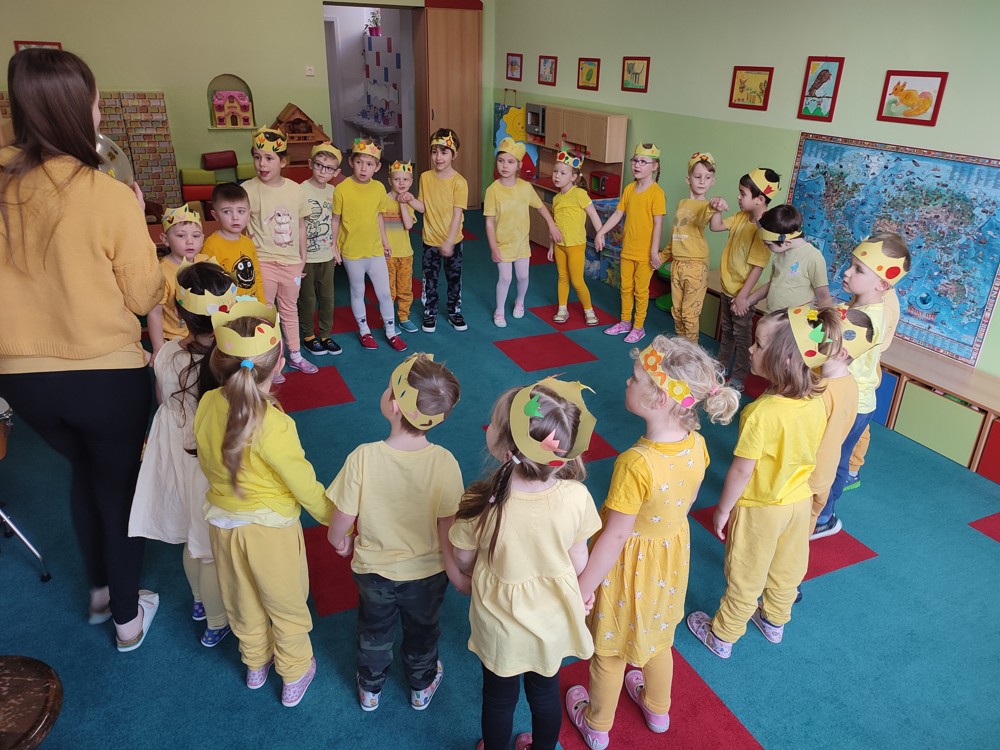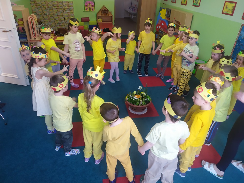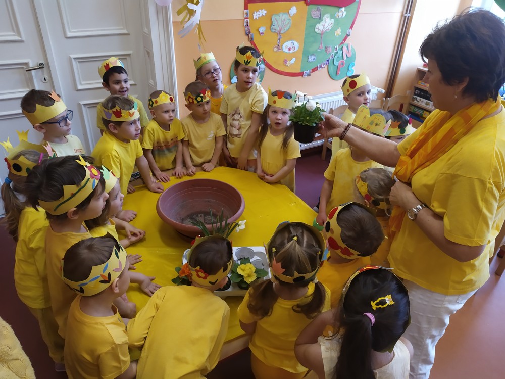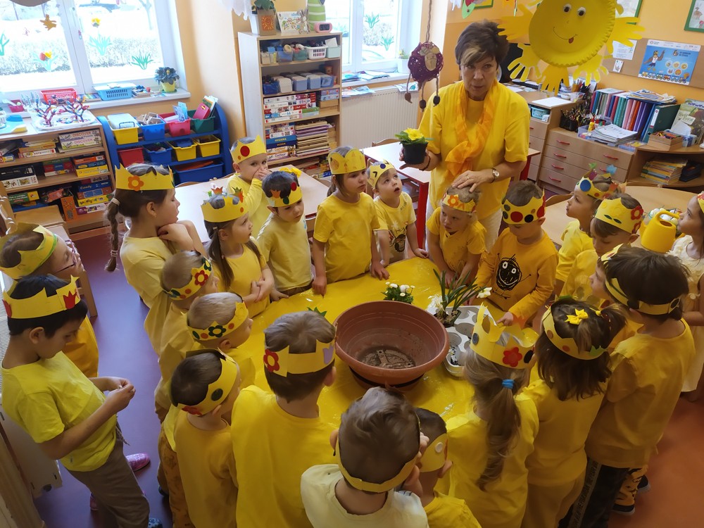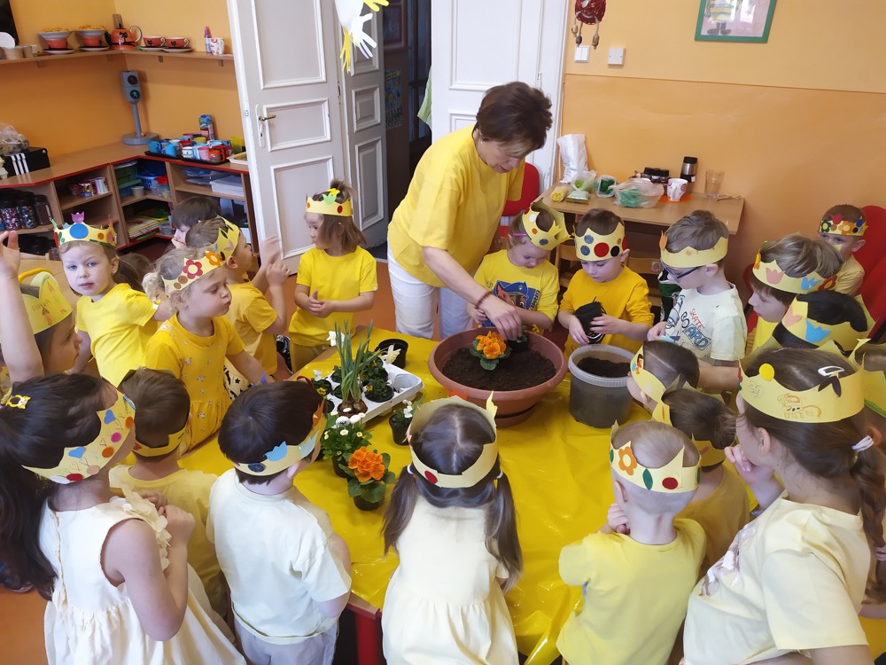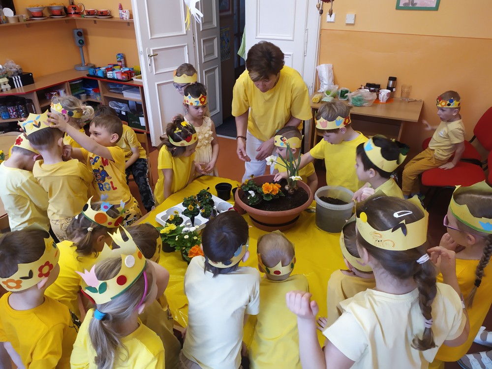 Do školky dnes děti přicházely ve žlutém oblečení a celé dopoledne veselou básničkou, písničkou i tanečkem vítaly jaro. Zasadily jarní zahrádku, ale musely ji uchránit před přízemním mrazíkem, který se nechtěl jen tak vzdát své vlády.
