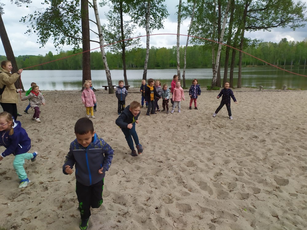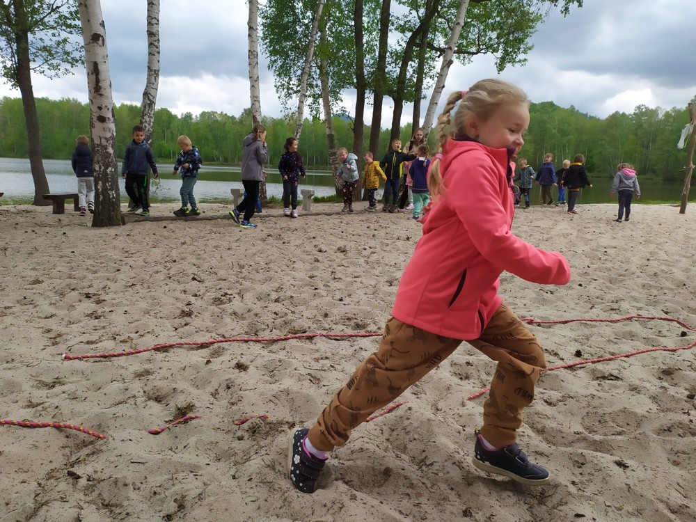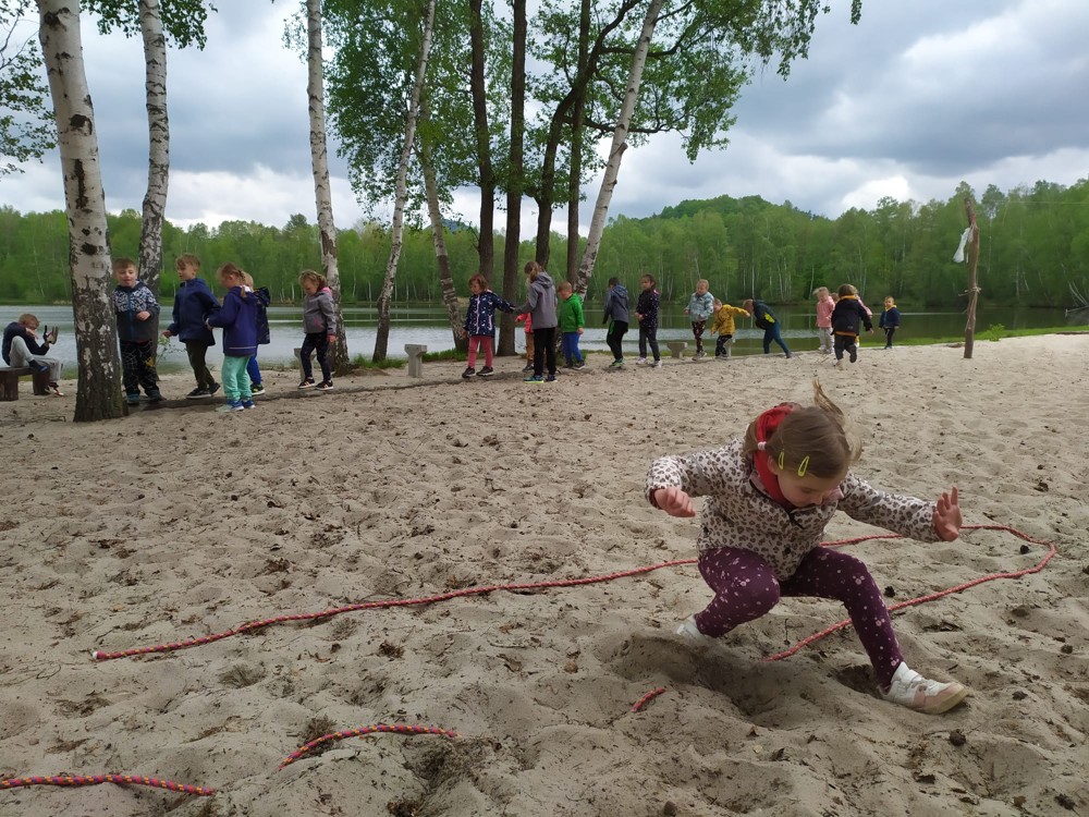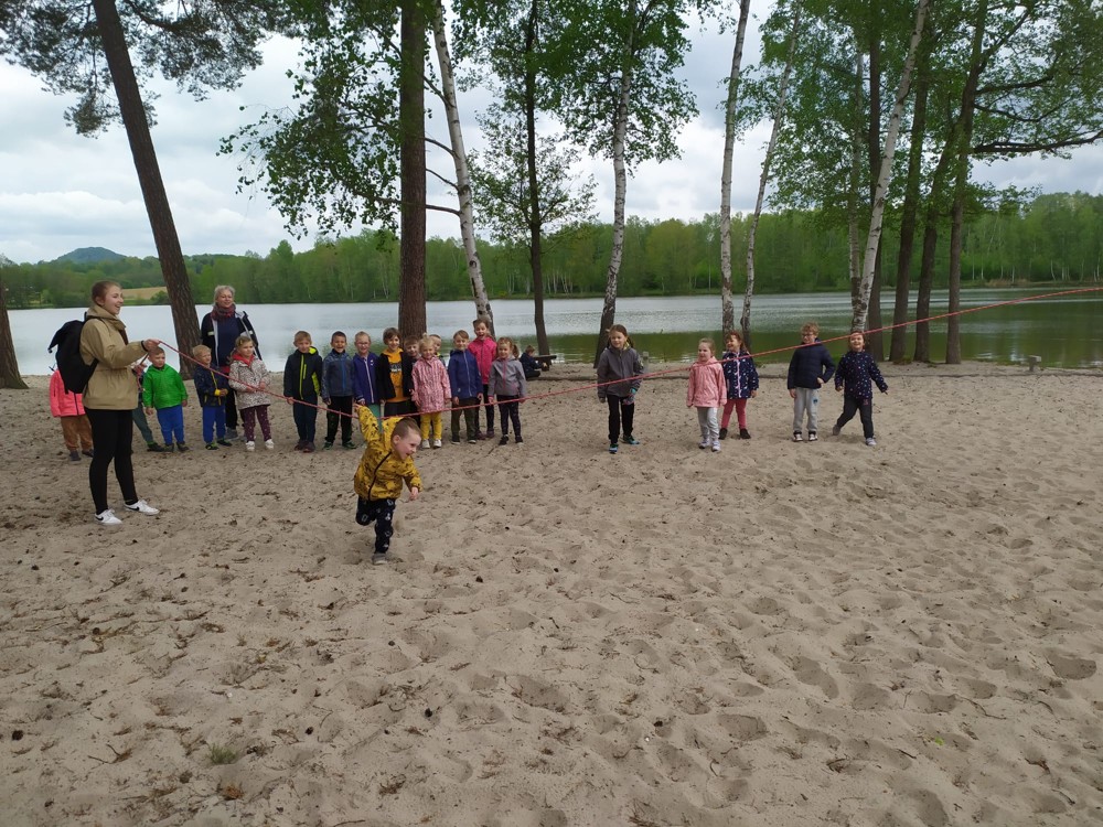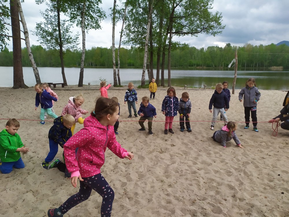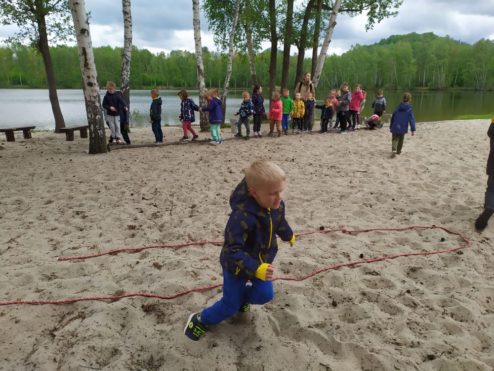 Dopoledne jsme u velikého rybníka, pro záchranu vodních bytostí, plnili spoustu úkolů. Děti hrály želví a čapí honěnou, zpívaly, přeskakovaly přes potok, přecházely nebezpečnou lávku, podbíhaly lano, kreslily vlny do písku a naučily se kouzelné zaklínadlo.