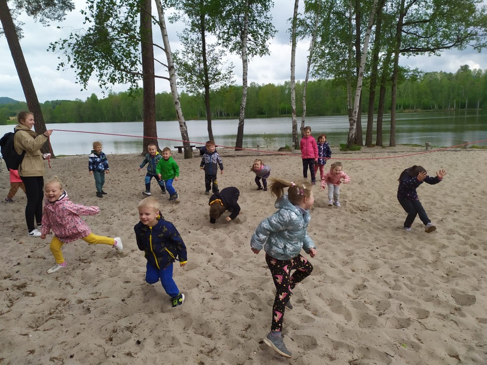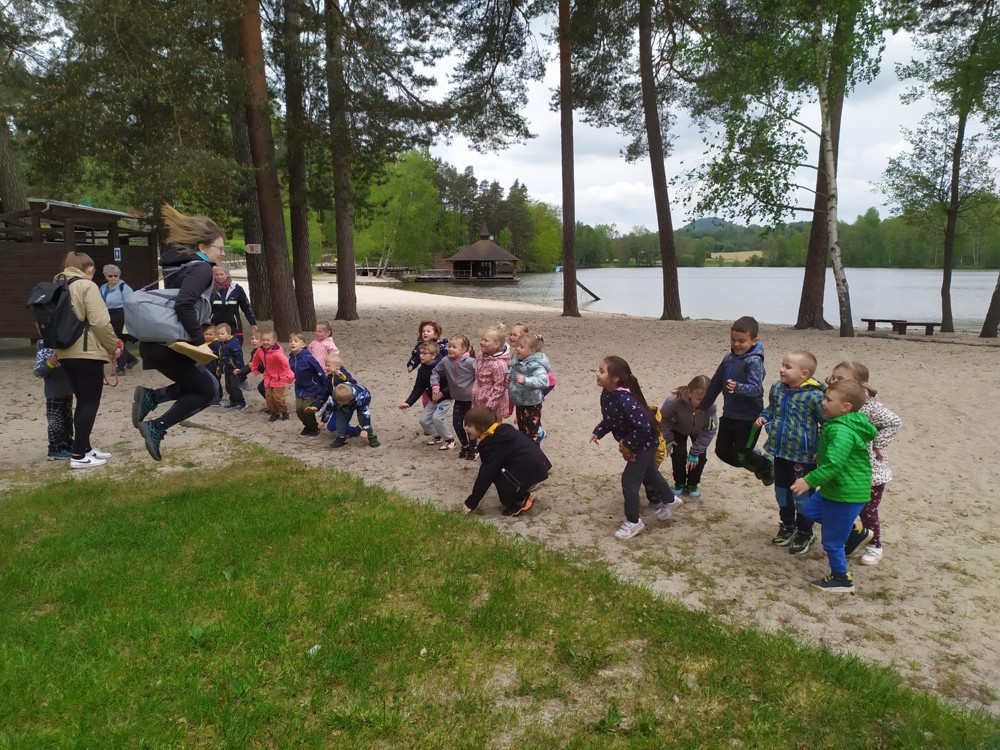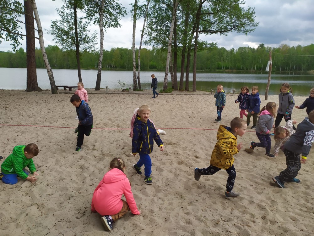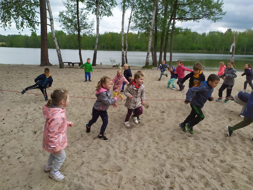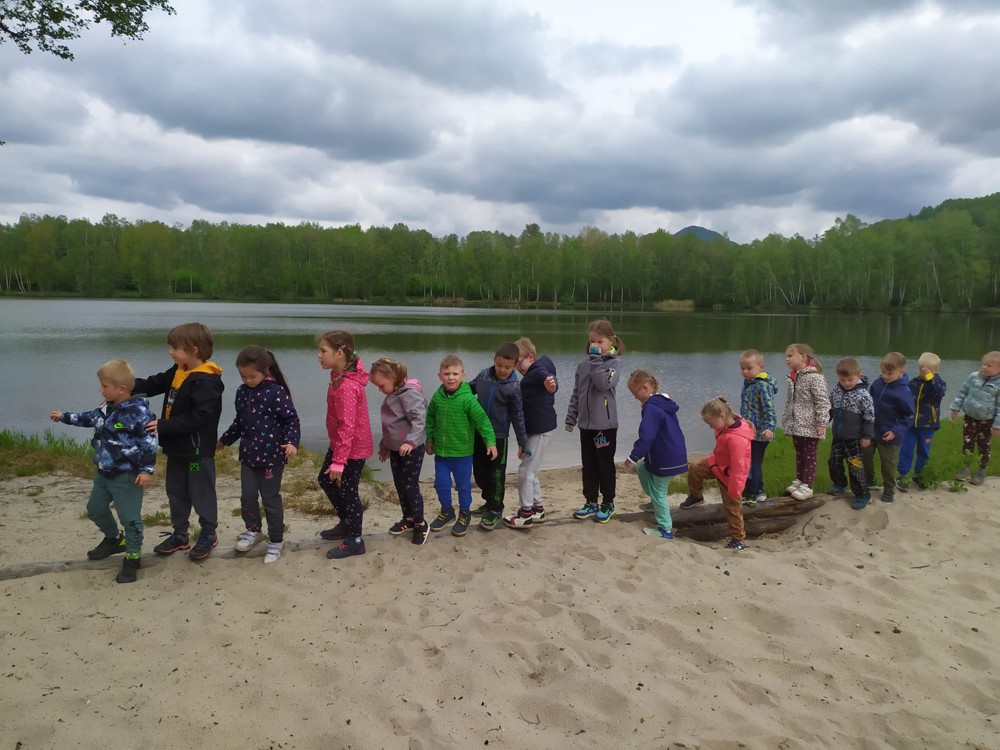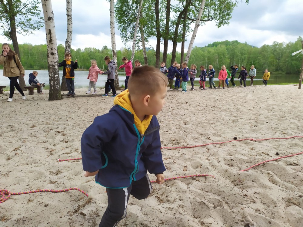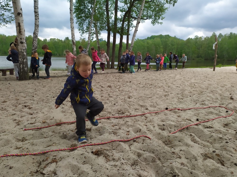 Dopoledne jsme u velikého rybníka, pro záchranu vodních bytostí, plnili spoustu úkolů. Děti hrály želví a čapí honěnou, zpívaly, přeskakovaly přes potok, přecházely nebezpečnou lávku, podbíhaly lano, kreslily vlny do písku a naučily se kouzelné zaklínadlo.