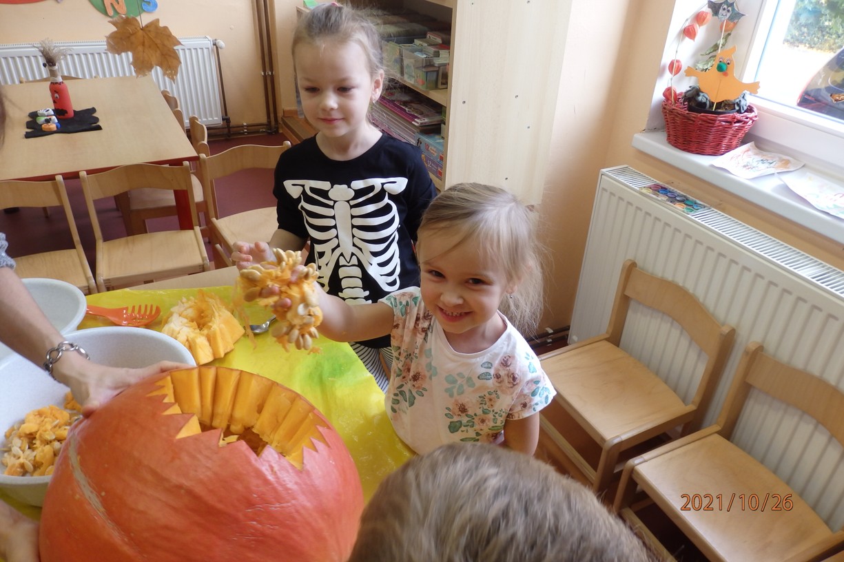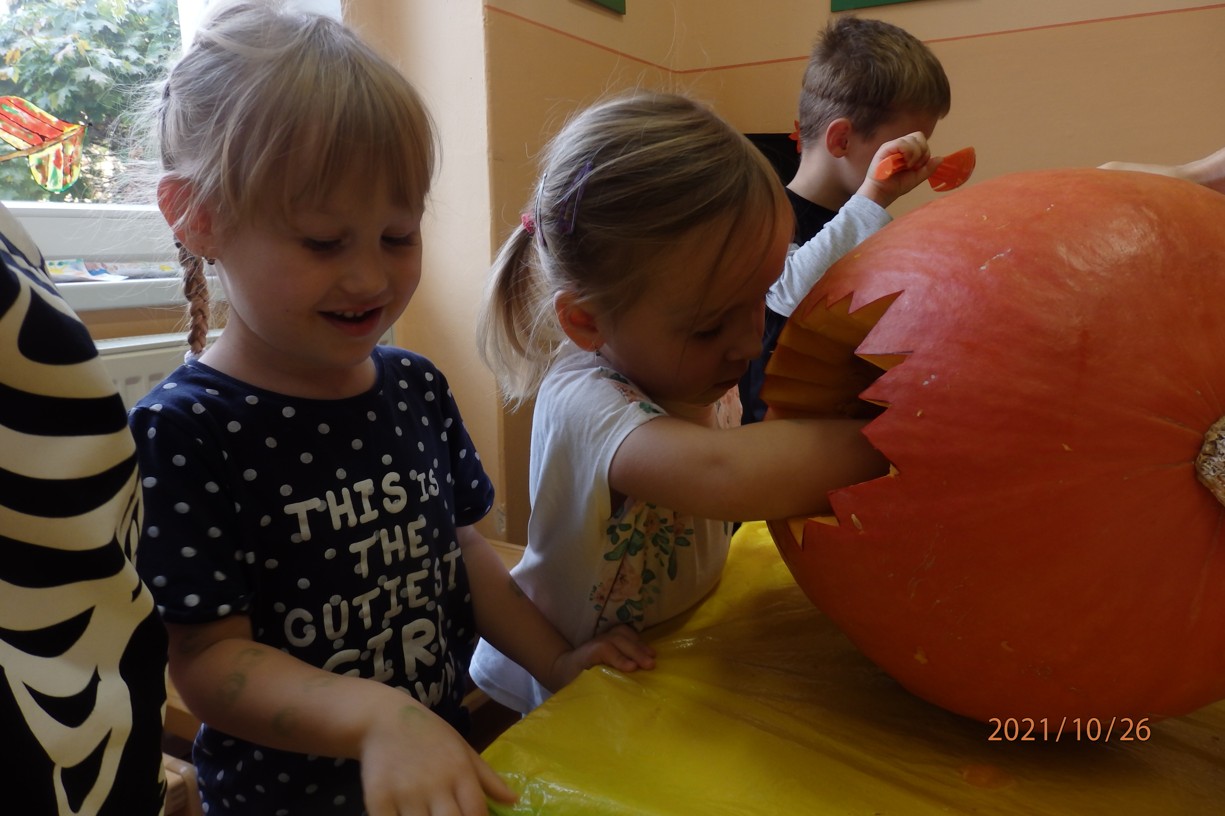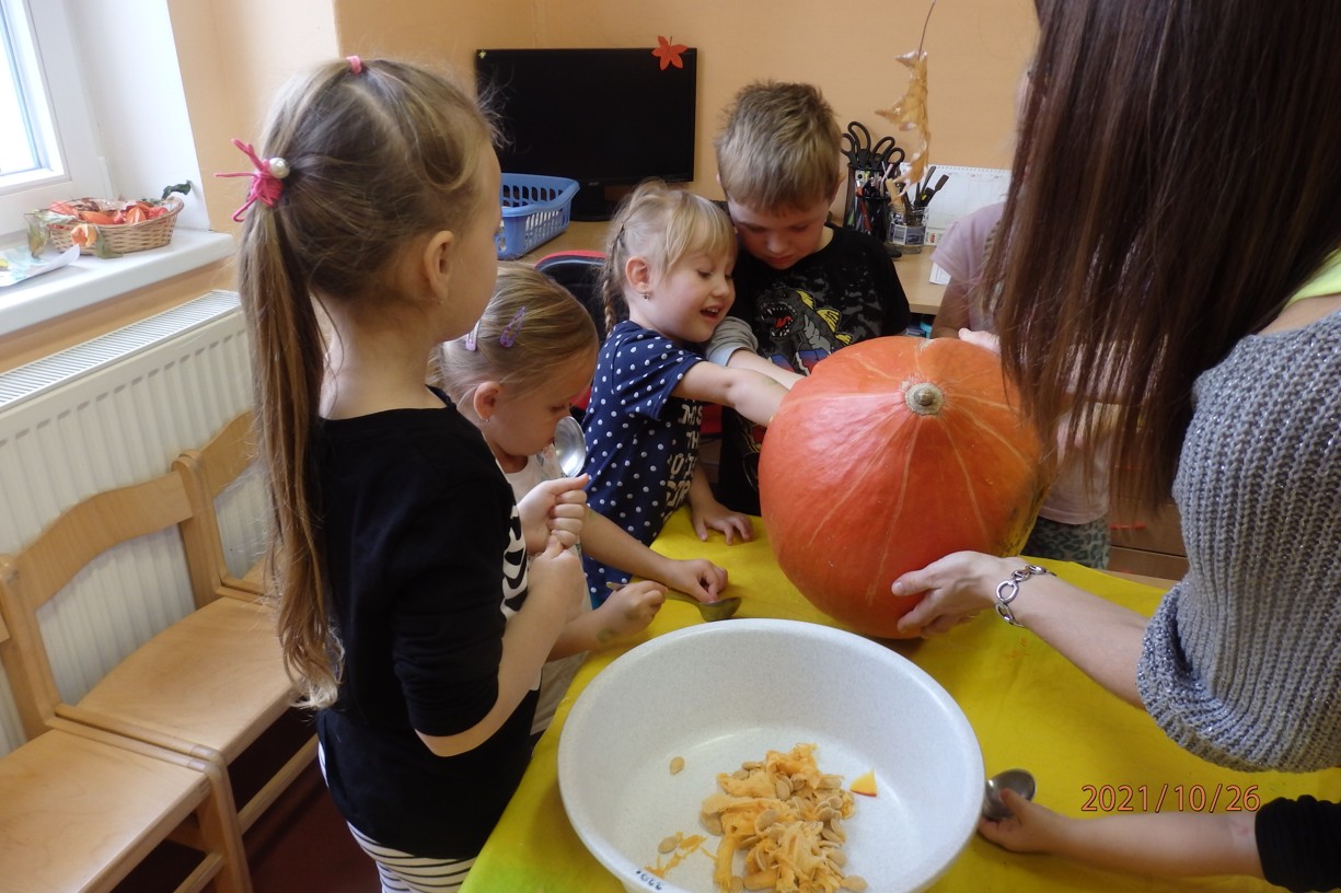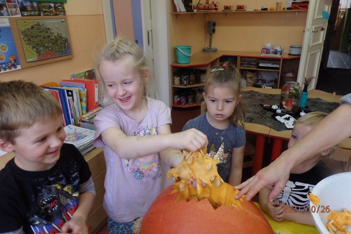 Na zahrádce nám vyrostla veliká dýně. Společně jsme si ji vydlabali, aby nám ozdobila naší školku a také nám mohla svítit při malém strašidelném karnevalu.