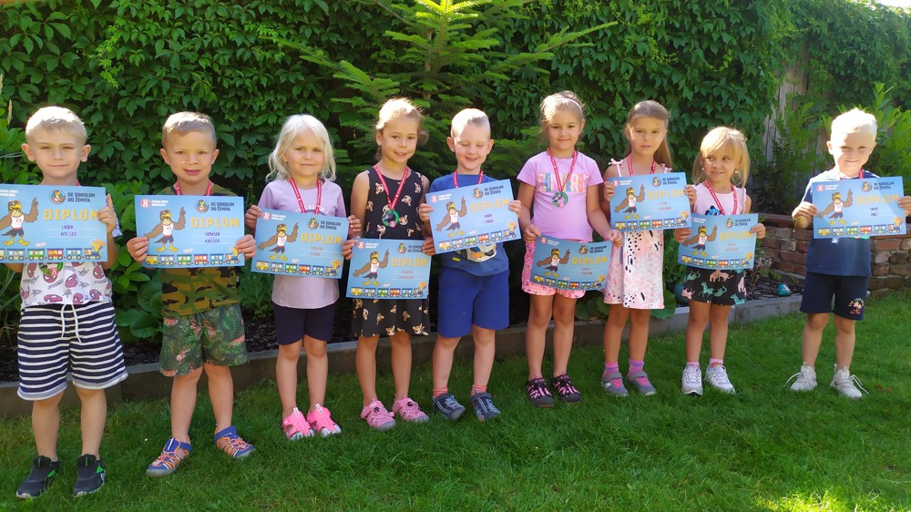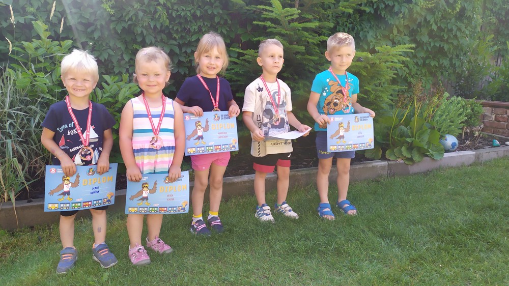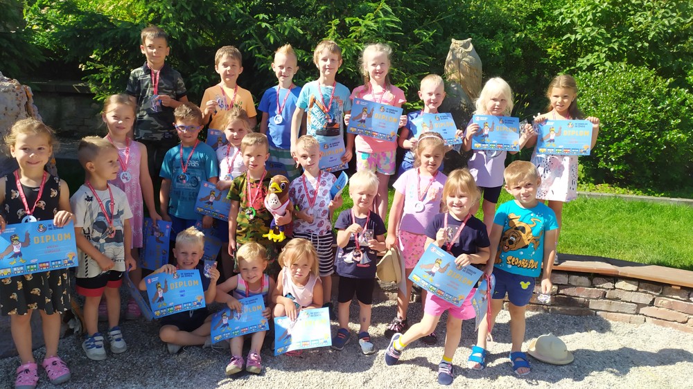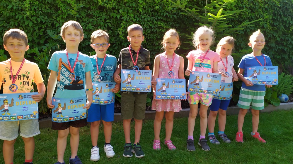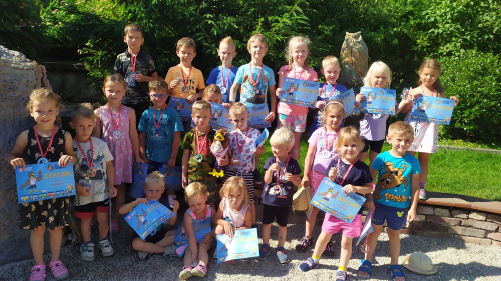Na zahradu za námi přiletěl Sokolík Pepík, aby děti pochválil za celoroční sportovní výkony a předal diplomy, medaile a malý dáreček.