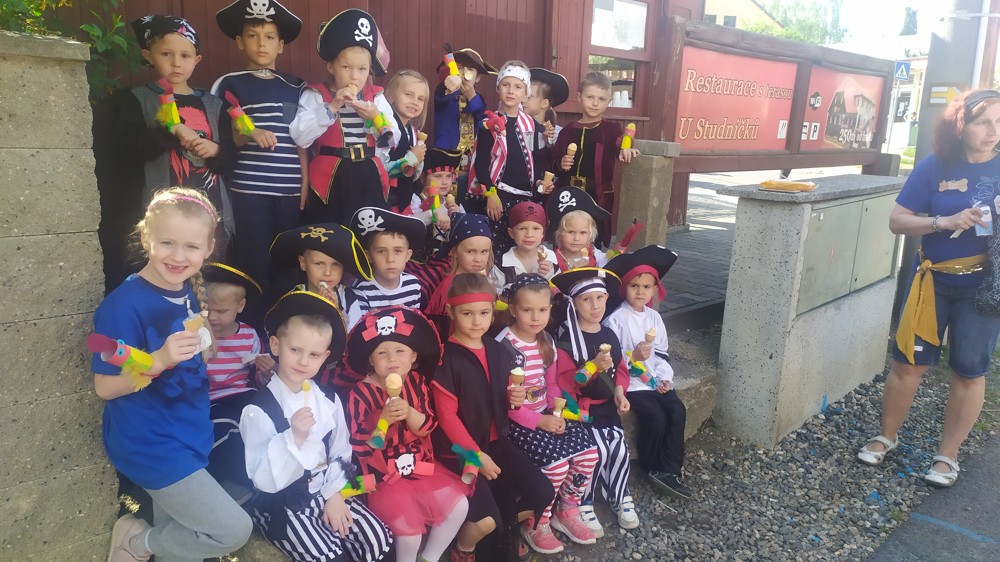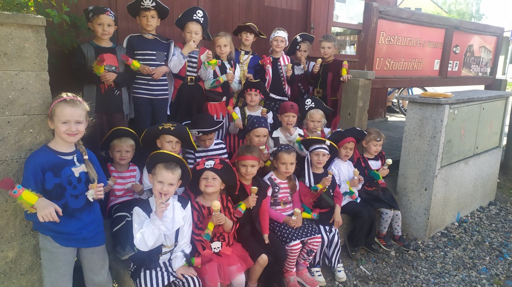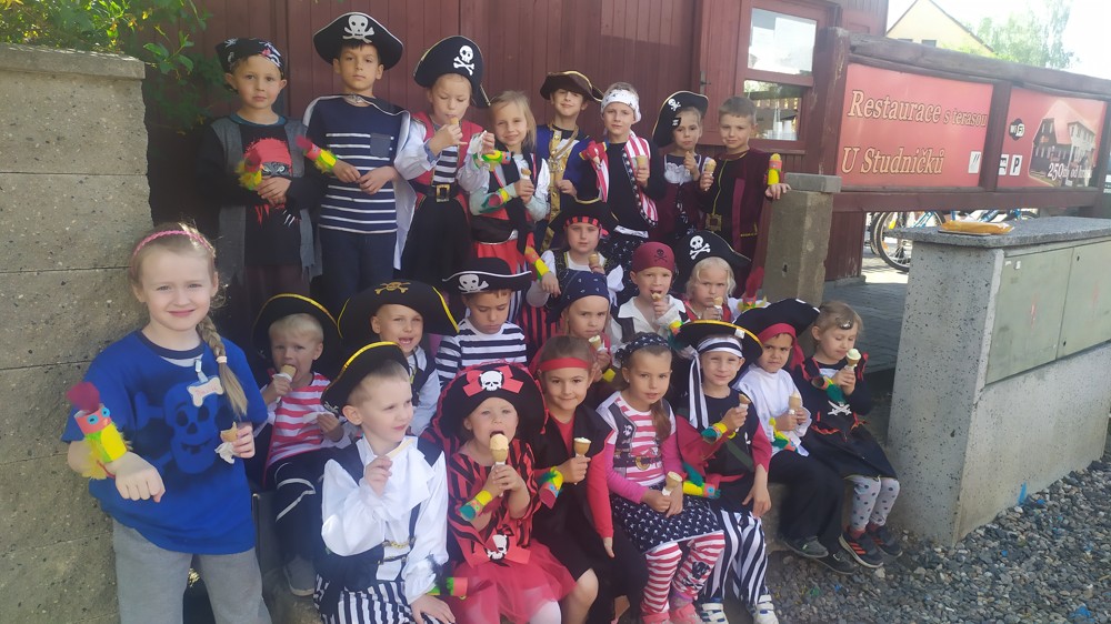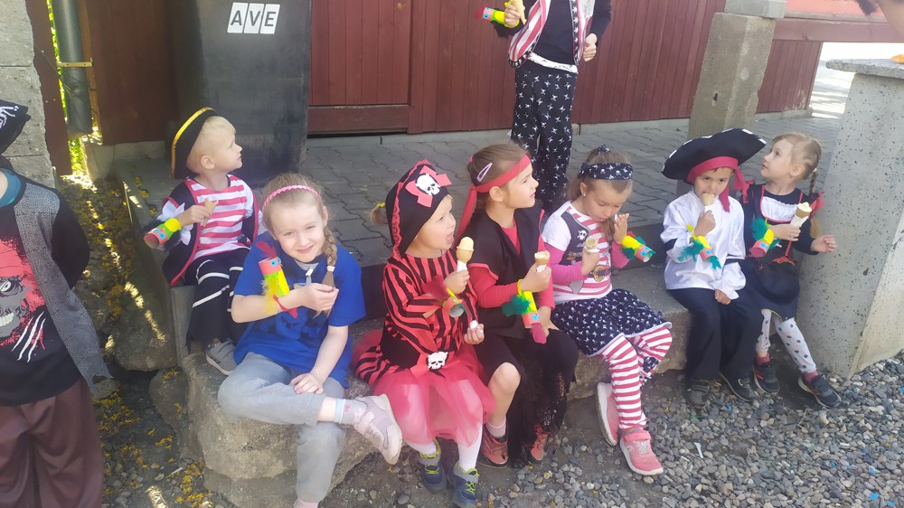 Zmrzlinka byla veliká mňamka. Teď už zbývá jen zabalit a vyplout. Pirátský koráb vyplouvá zítra v 10.00 hod. Předpokládaný návrat do reality plánujeme 11.30 – 12.00 hod. VZKAZ V LÁHVI – nezapomeňte, že se v úterý fotíme. Školáci potřebují pirátský oblek.