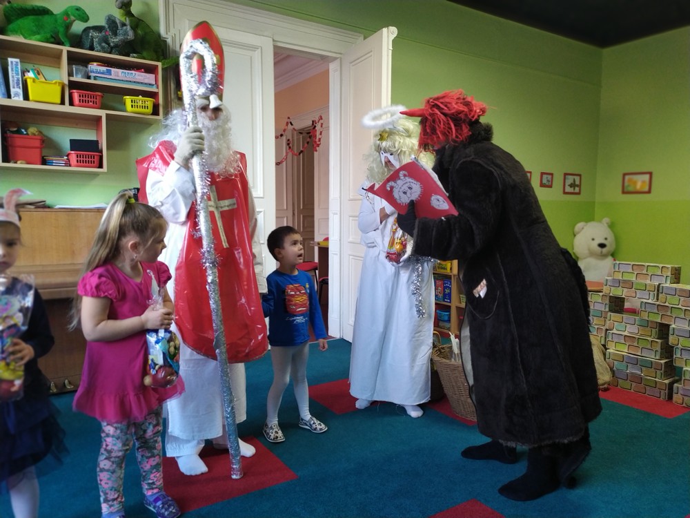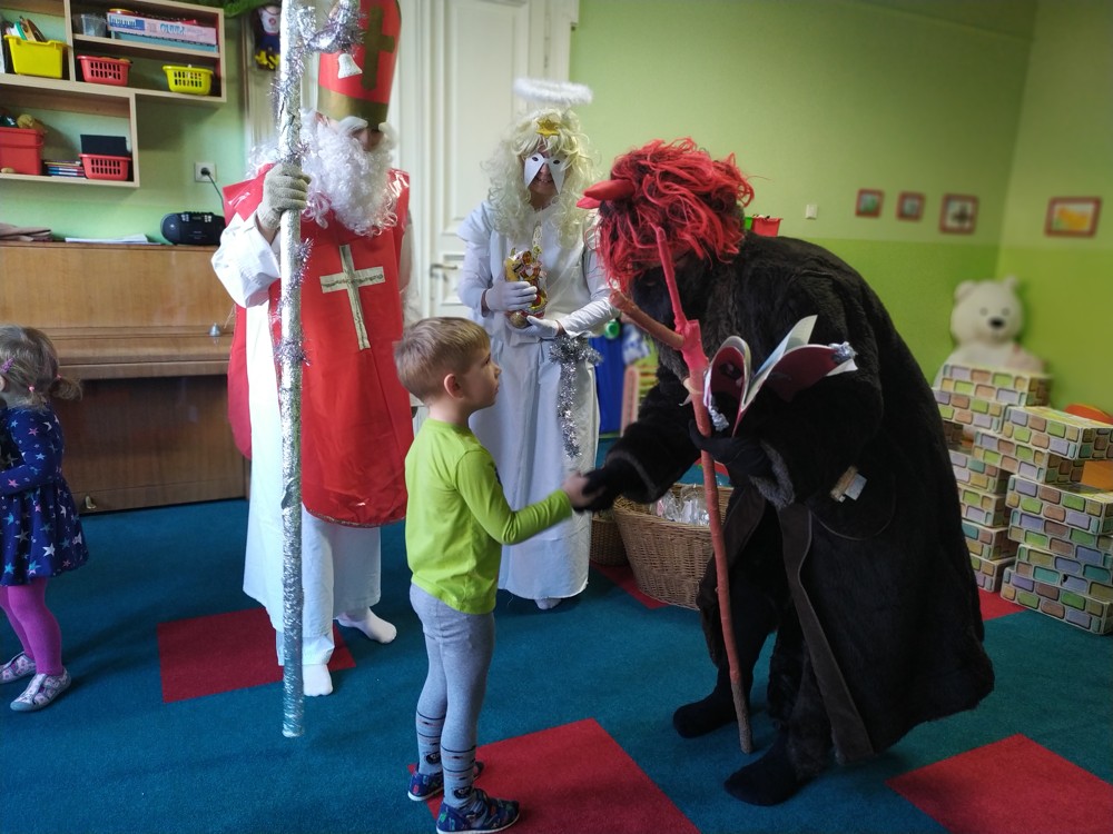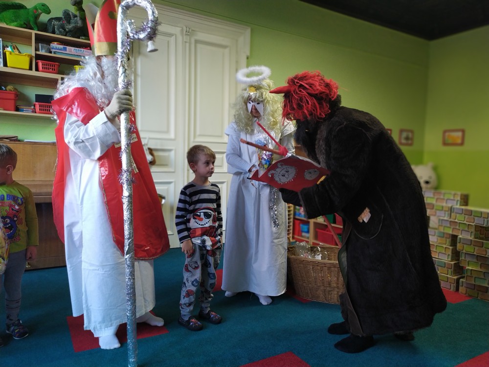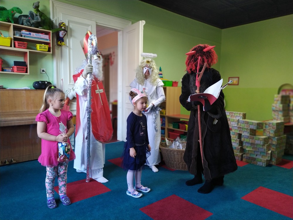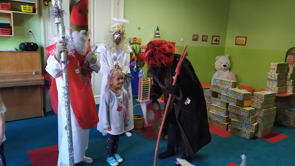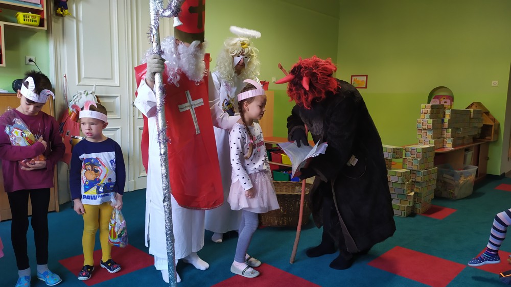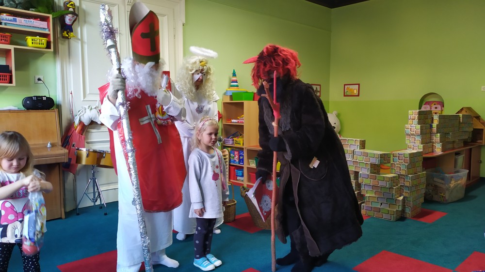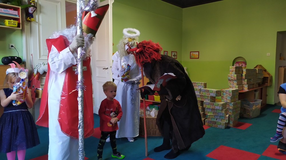 Do školky za námi přišel Mikuláš s čertem a andělem a za pěknou písničku nebo básničku nadělovali vitamíny, pár sladkostí, ale i brambor s kouskem uhlí za malé zlobení. Letos měly děti štěstí, protože z pekla poslali čertíka – učedníka, který přehlédl nějaký ten hříšek.
