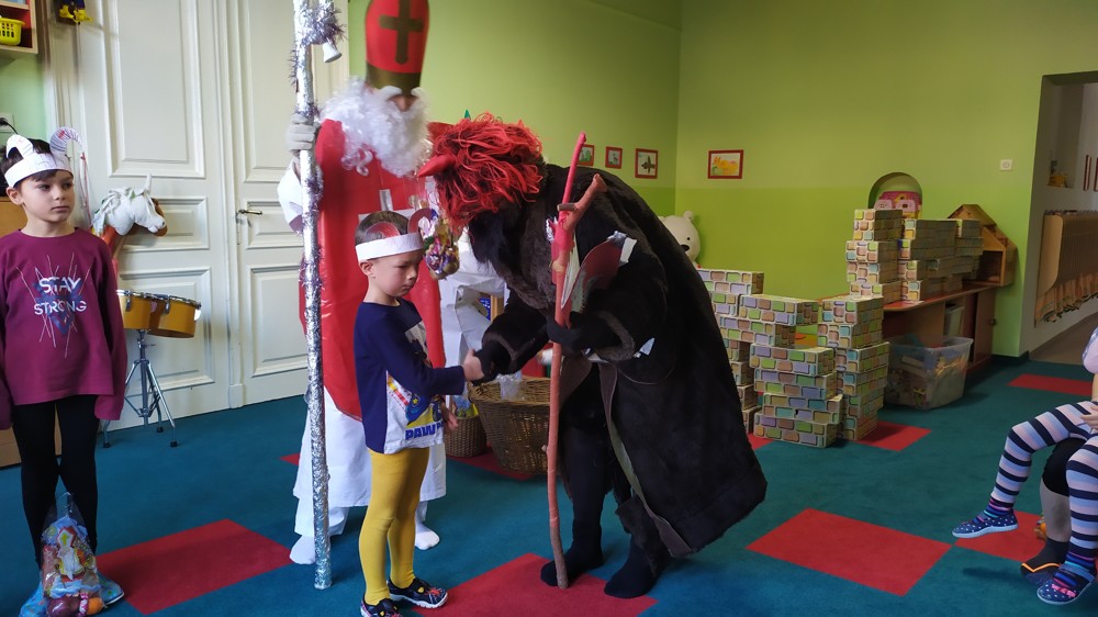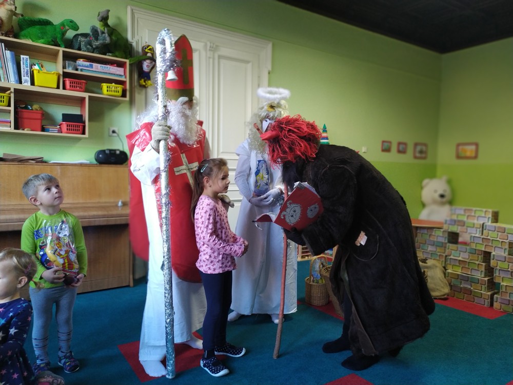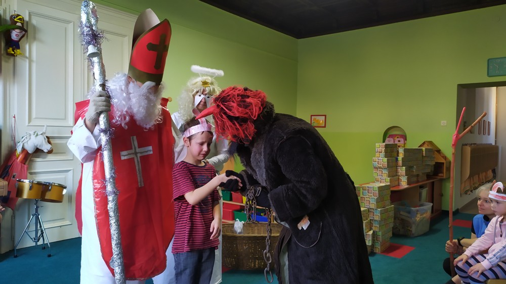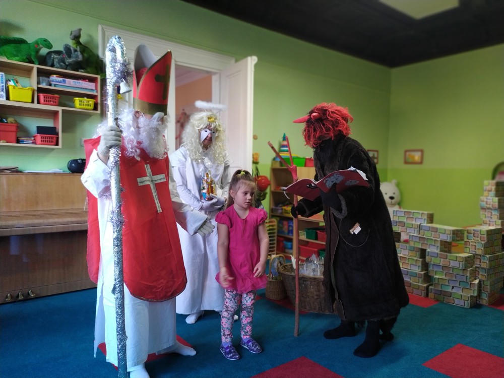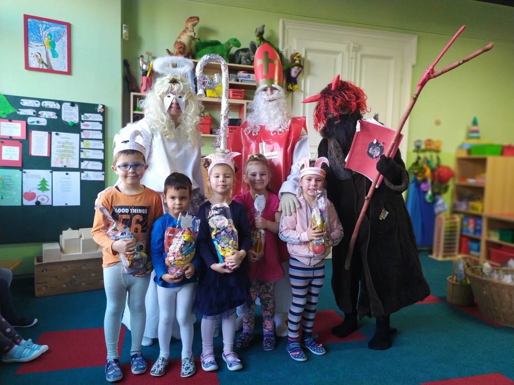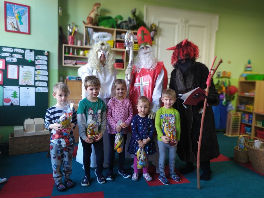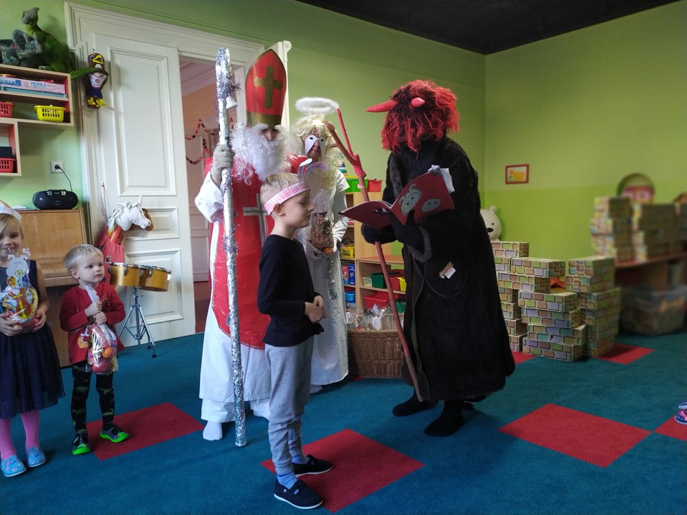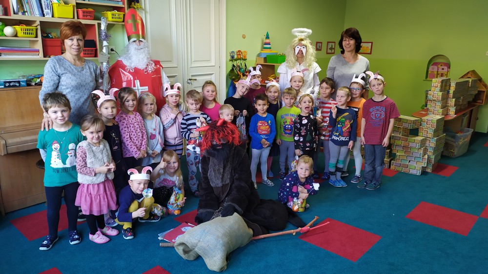 Do školky za námi přišel Mikuláš s čertem a andělem a za pěknou písničku nebo básničku nadělovali vitamíny, pár sladkostí, ale i brambor s kouskem uhlí za malé zlobení. Letos měly děti štěstí, protože z pekla poslali čertíka – učedníka, který přehlédl nějaký ten hříšek.