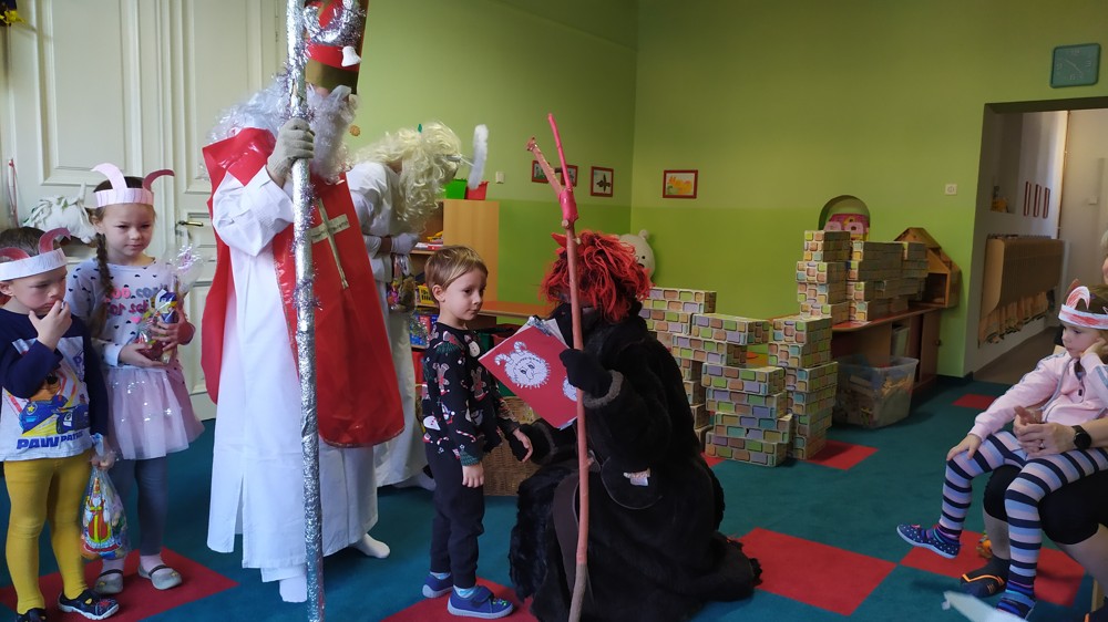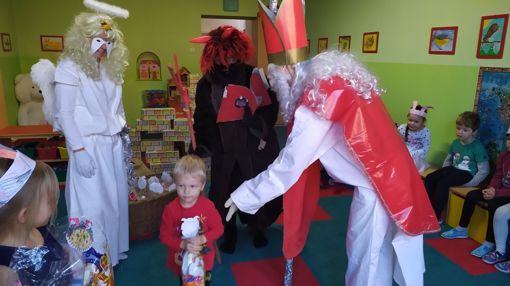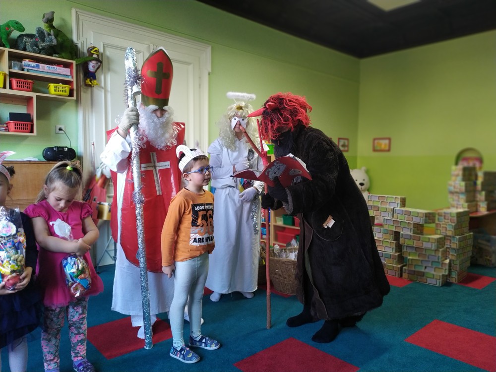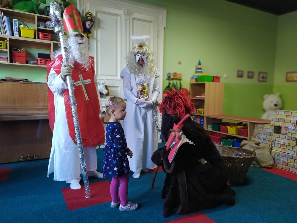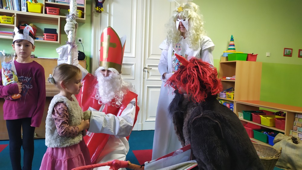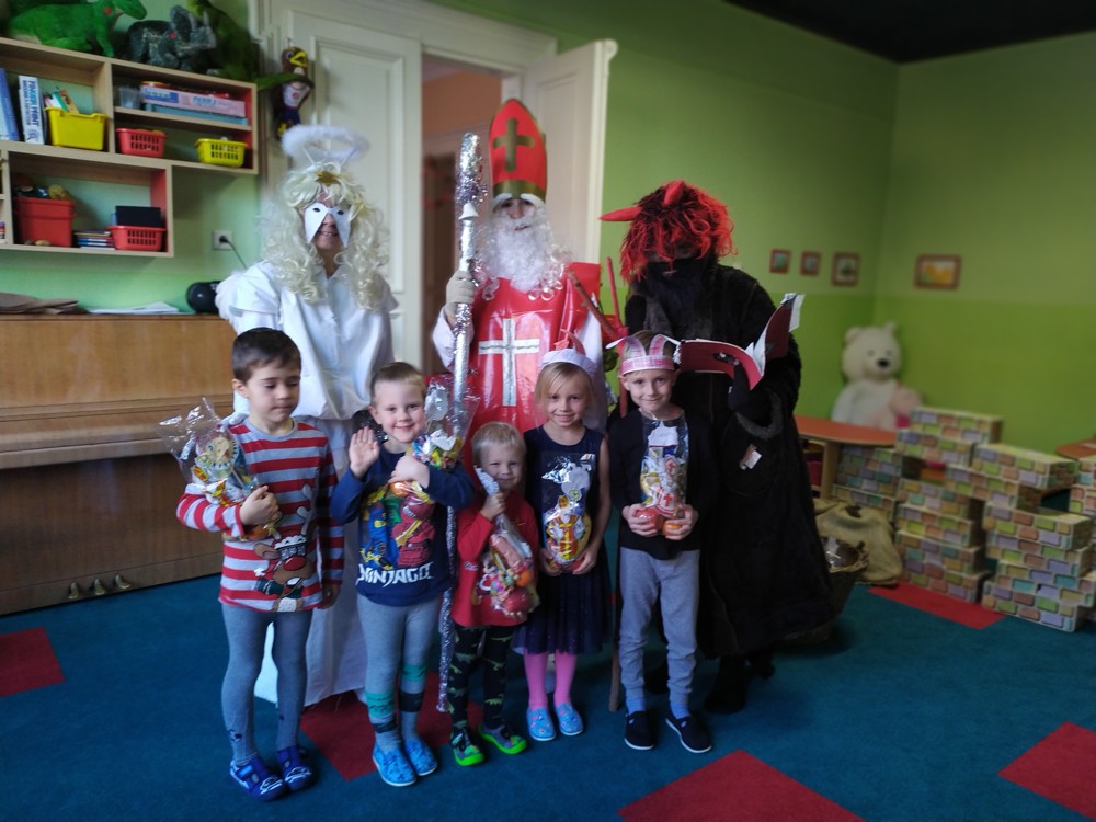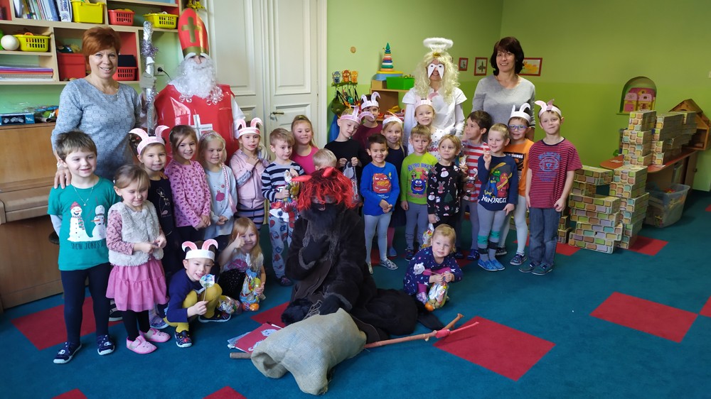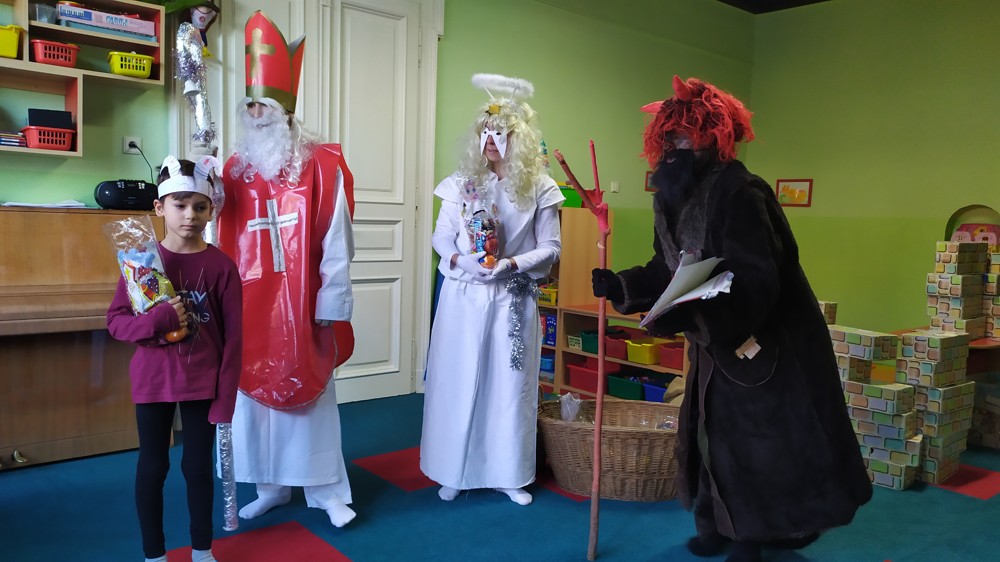 Do školky za námi přišel Mikuláš s čertem a andělem a za pěknou písničku nebo básničku nadělovali vitamíny, pár sladkostí, ale i brambor s kouskem uhlí za malé zlobení. Letos měly děti štěstí, protože z pekla poslali čertíka – učedníka, který přehlédl nějaký ten hříšek.