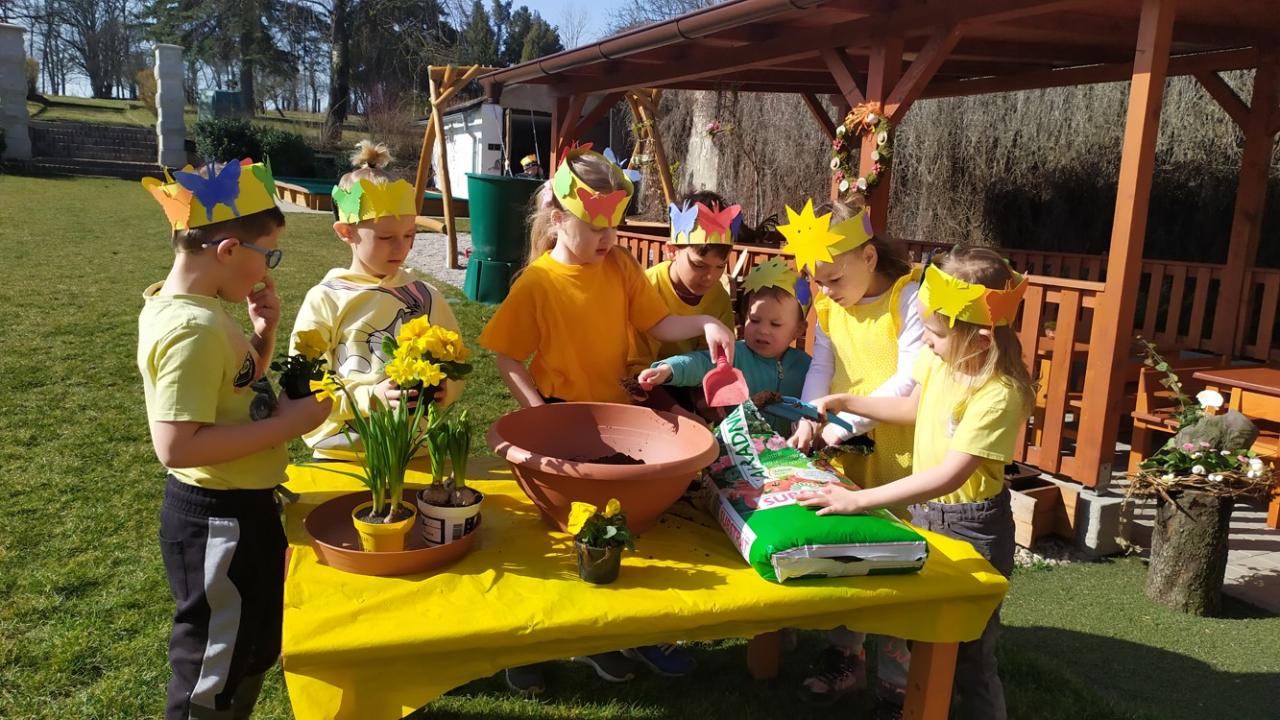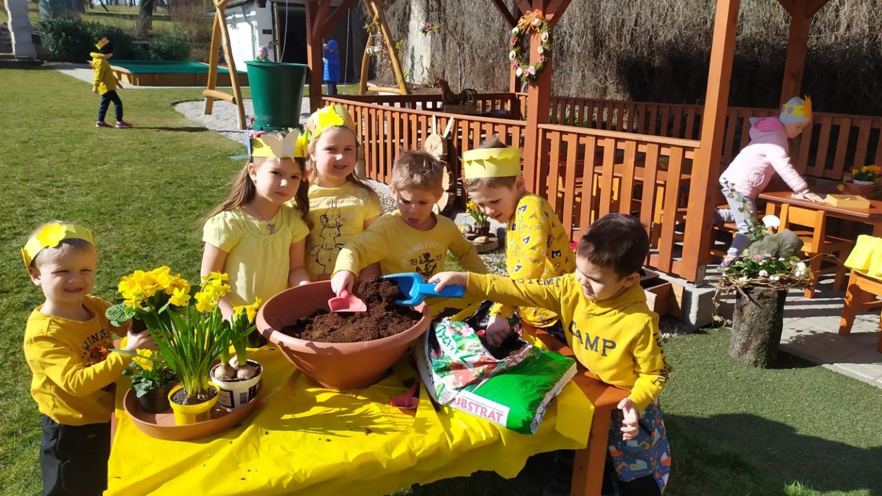 Musely také ochránit naši malou zahrádku, uprostřed herny, před nepříjemným přízemním mrazíkem, kterého nakonec rozpustily hřejivé paprsky sluníček, které děti vyrobily doma se svými rodiči a zbylo z něj jen trochu vody v mističce. Na zahrádce děti kytičky zasadily a společně se o ně budou starat.