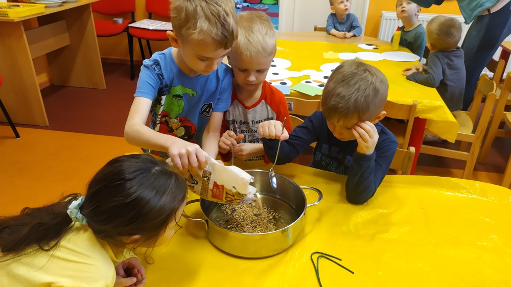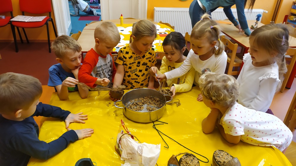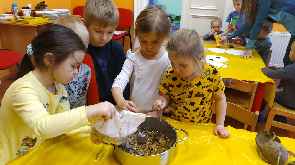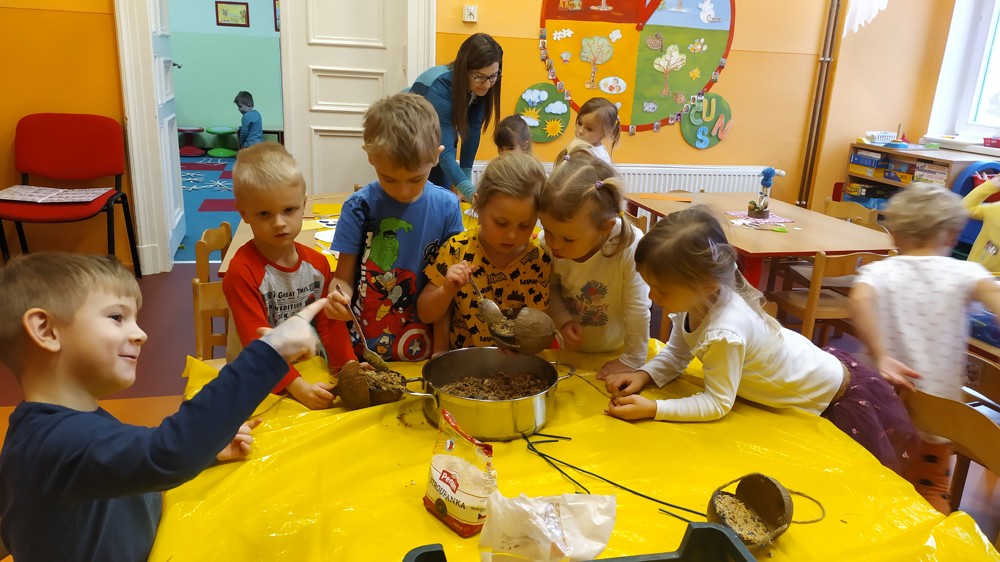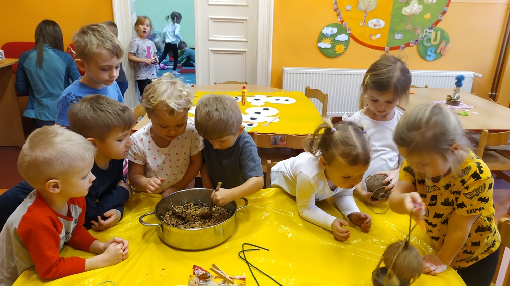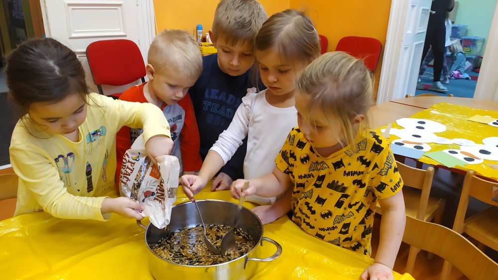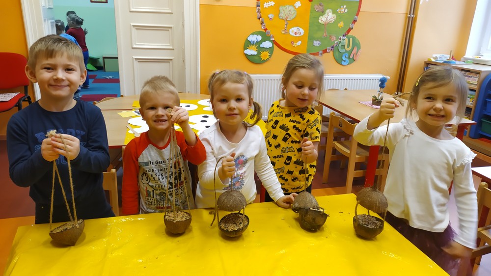 Venku mrzne a ve školce se děti pustily do vaření semínkových dobrot pro ptáčky. Směsí děti naplnily krmítka z kokosových ořechů a za pomoci paní učitelky zavěsily na stromy před okny naší školy, odkud budeme pozorovat, jak si ptáčci pochutnávají.